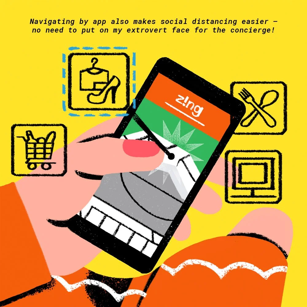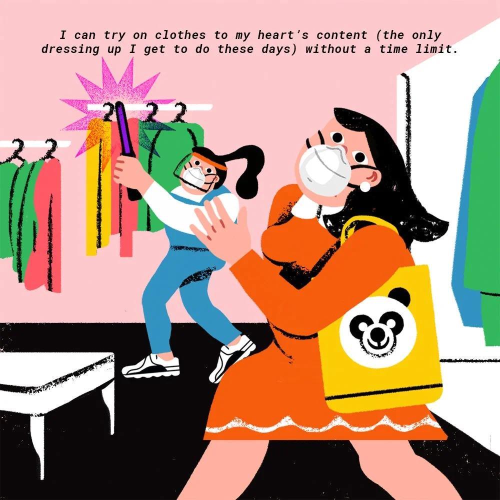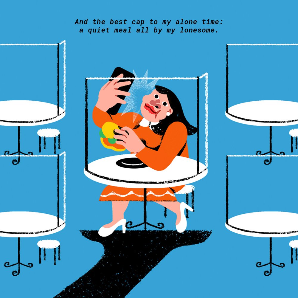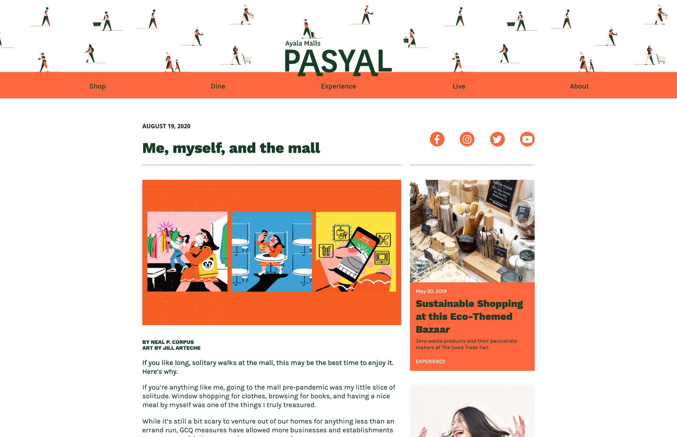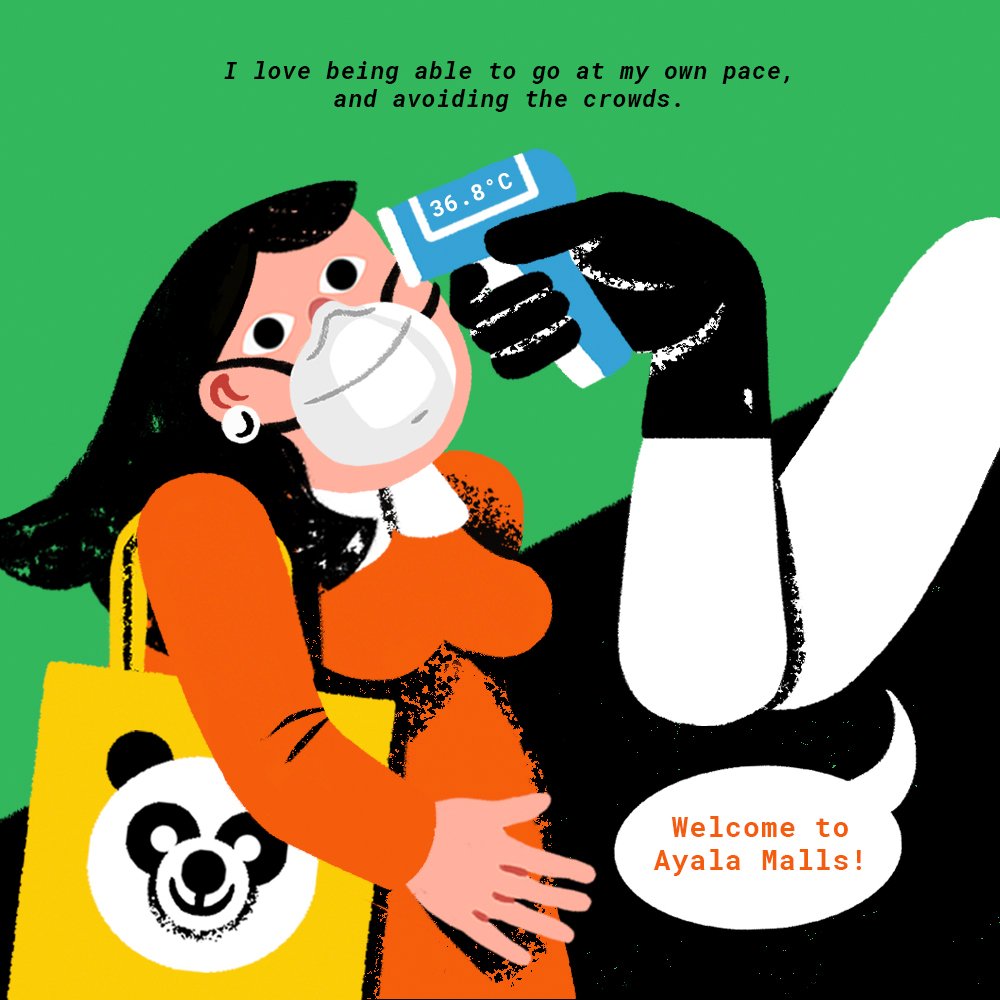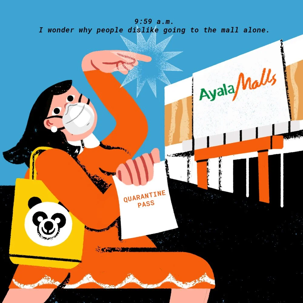 Comic illustrations for Ayala Malls Pasyal, Ayala Malls’ digital lifestyle platform, on the topic of enjoying alone time at the mall while practicing COVID-19 safety protocols