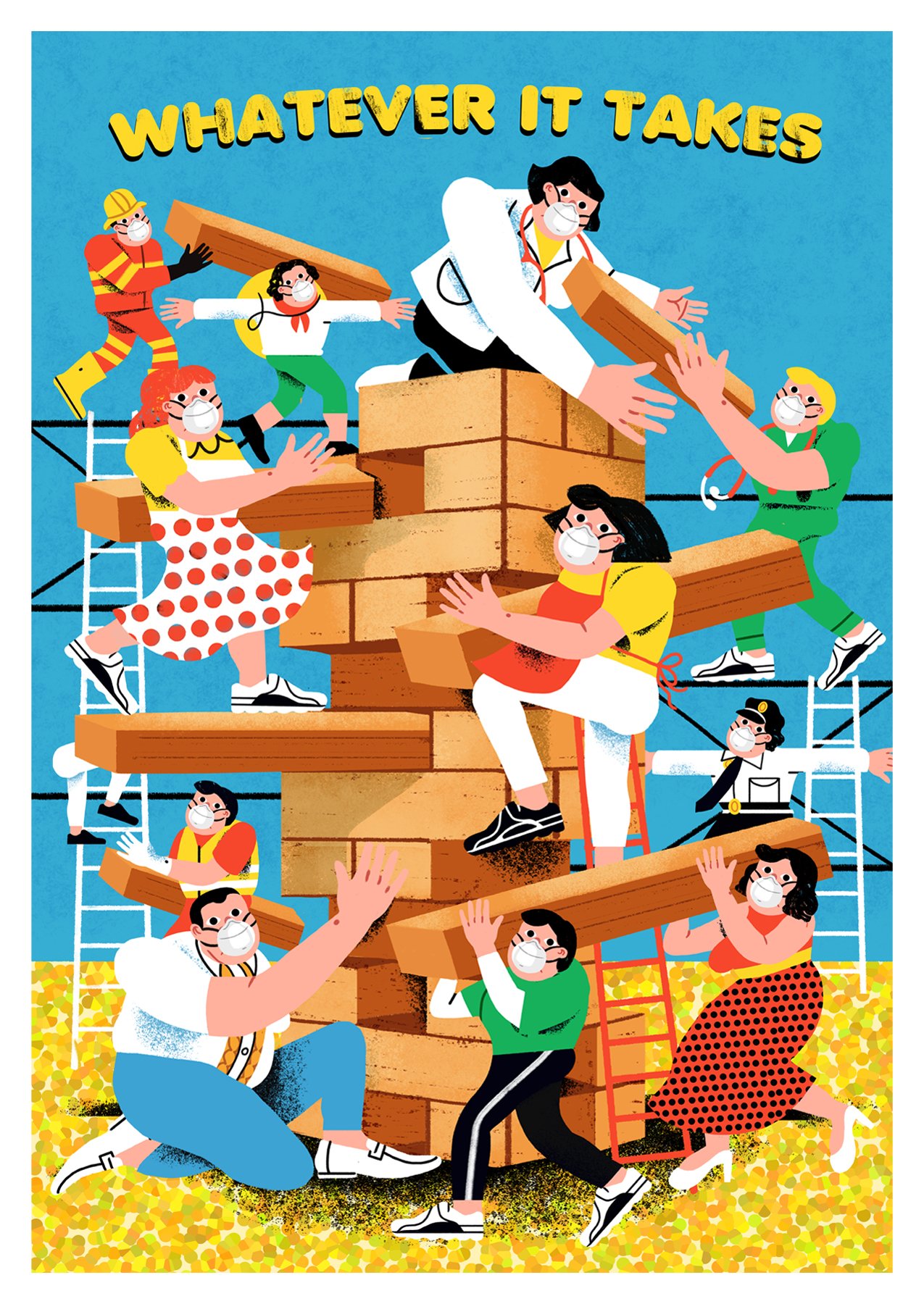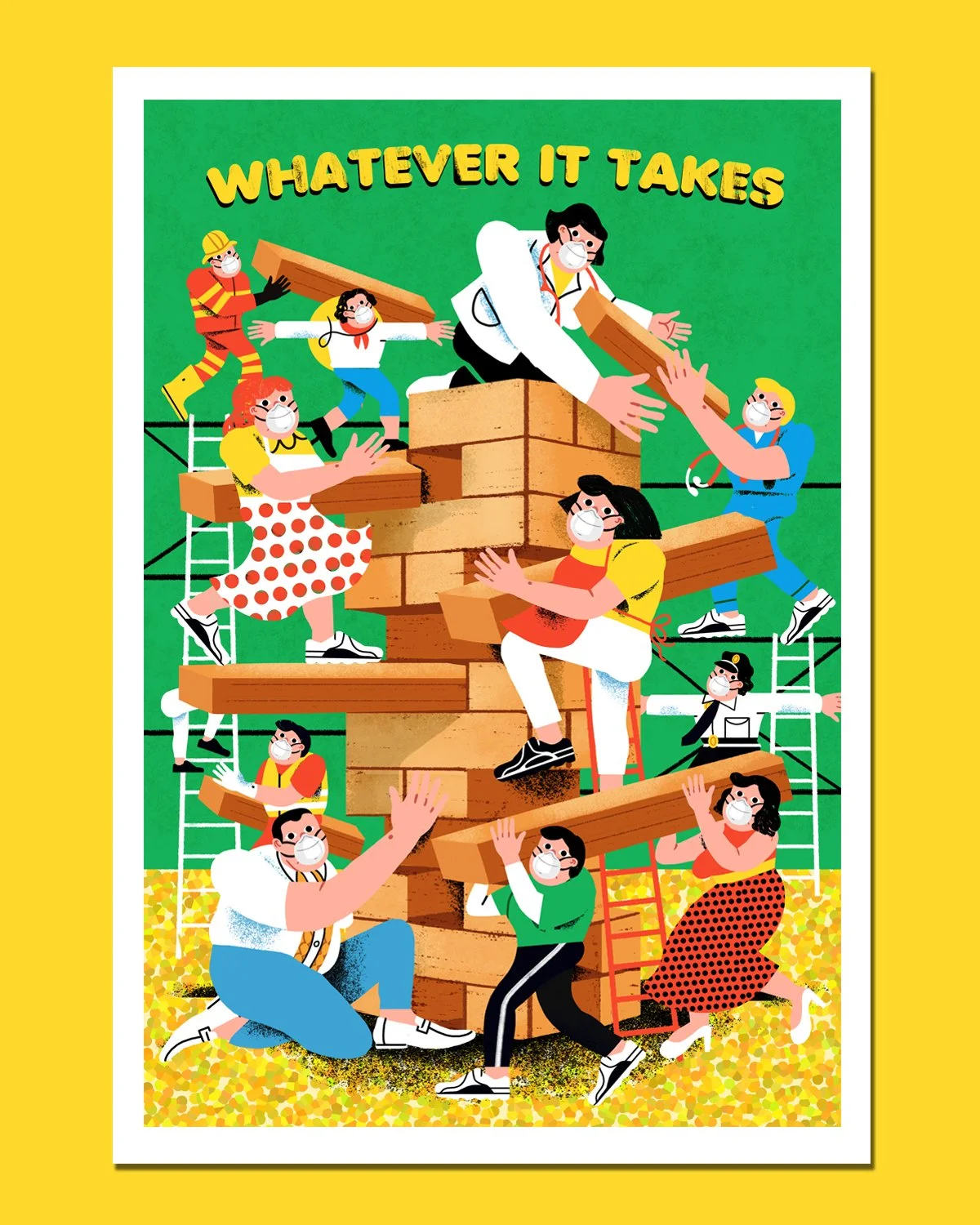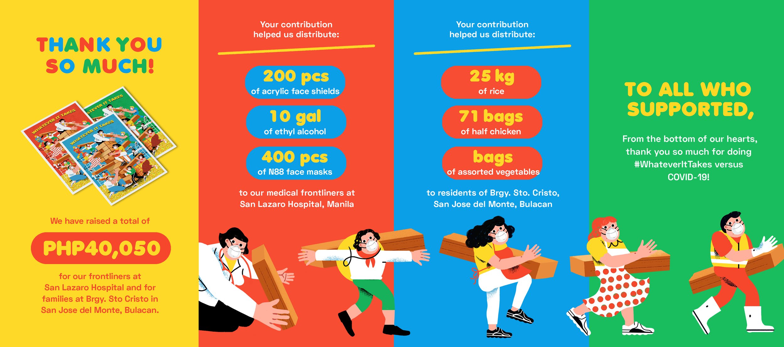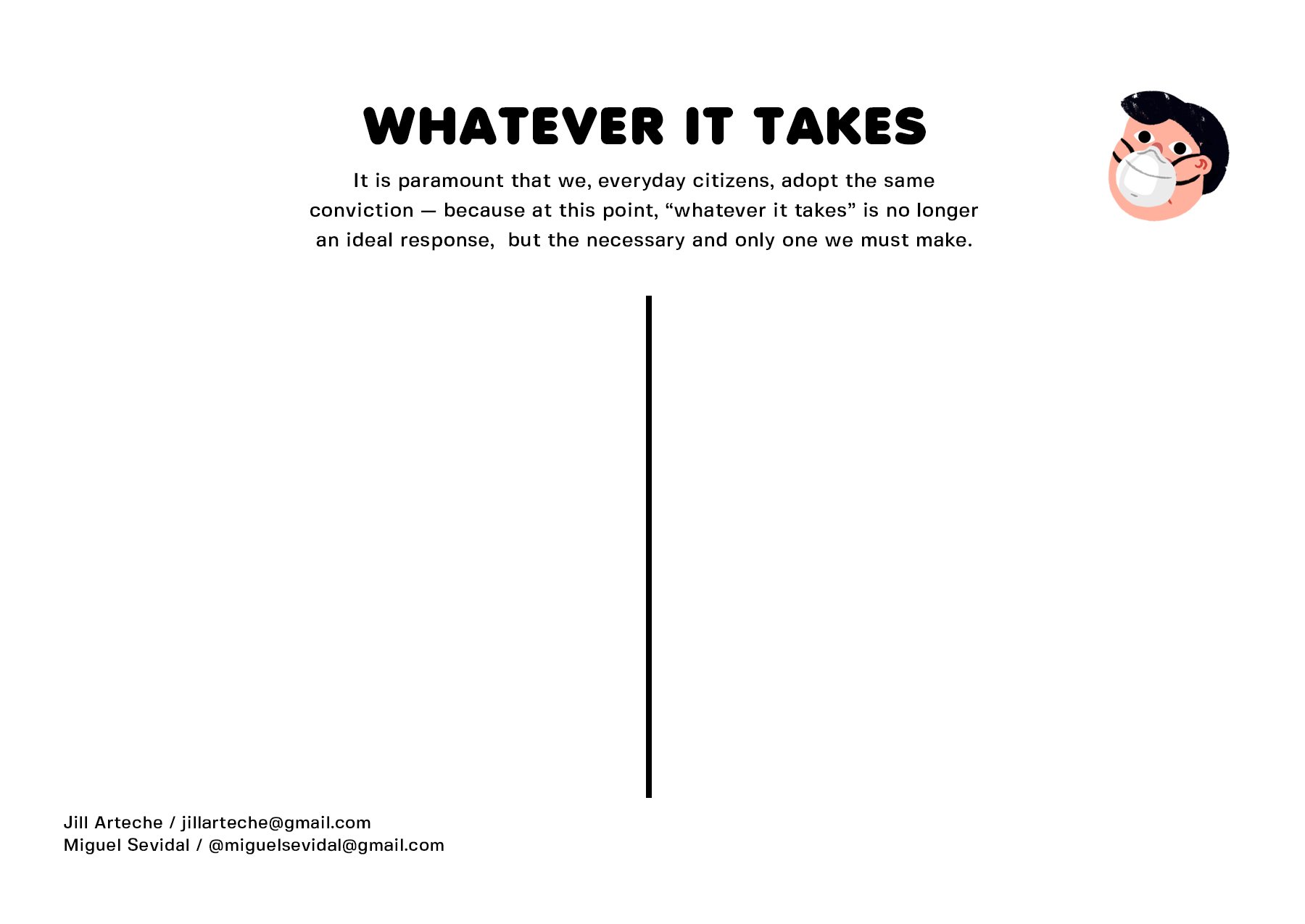 "Whatever It Takes" is a fundraiser initiative that was launched by myself and my good friend, Miguel Sevidal. We collaborated by selling postcard sets featuring my artwork alongside his essay. The goal of this initiative was to raise awareness and funds for our frontline workers and vulnerable families impacted by the COVID-19 pandemic.